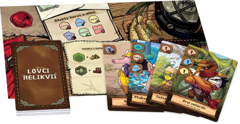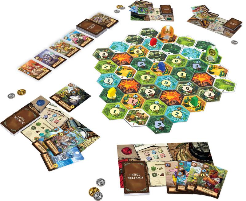 Společenská hra Lovci relikvií. Dobrodružný deckbuilding pro celou rodinu. Vydejte se na expedici a hledejte vzácné relikvie!Ostrov ukrývá starobylé relikvie. Pro jejich získání je třeba podniknout expedici. Naštěstí pro vás na jižní straně ostrova čeká spousta průzkumníků ochotných vydat se na expedici s vámi... Samozřejmě za nějaký ten zlaťák. Žádné nemáte? To není problém. Stačí trochu bádání a můžete získat dost zlaťáků k najmutí členů expedice. Vyrazte na sever a vykopejte ukryté relikvie! Ale pospěšte si, konkurenti jsou vám v patách...