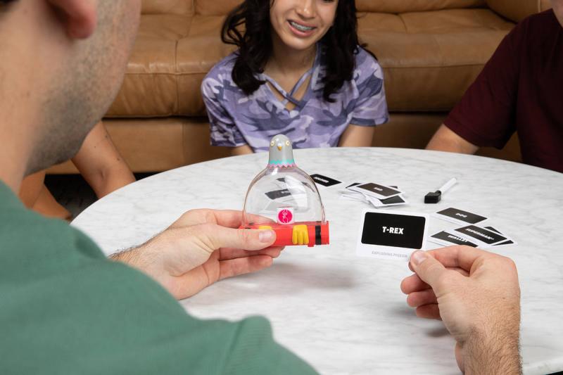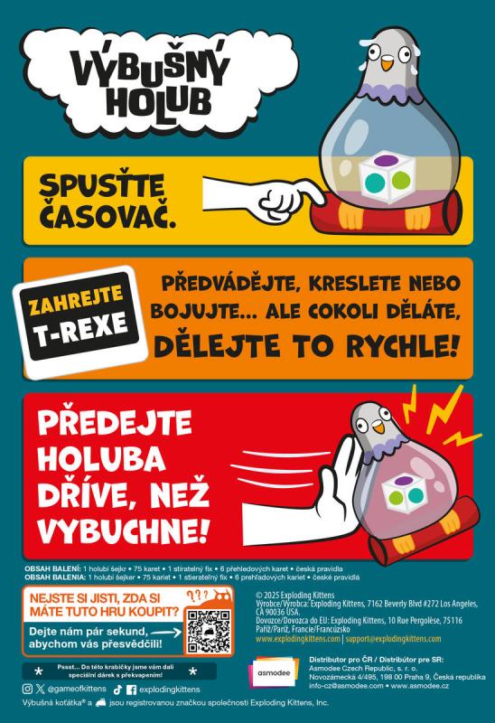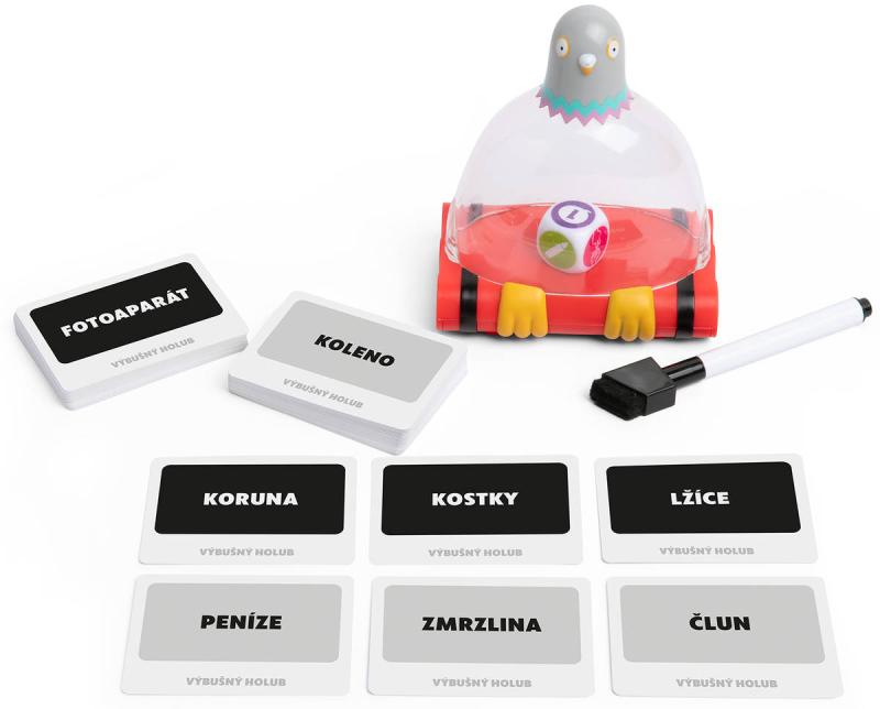 Výbušný holub - Rodinná společenská party hra, kde hrajete rychle, hádáte ještě rychleji a nesmíte být přistiženi, když holub vybuchne!Výbušný holub je nová verze hry "horký brambor", kde se budete snažit co nejrychleji splnit výzvy, abyste mohli holubí šejkr předat druhému týmu. Pokud držíte holubí šejkr v momentě, kdy vybuchne, prohráváte a druhý tým získává bod! První tým, který dosáhne 3 bodů, vyhrává.
