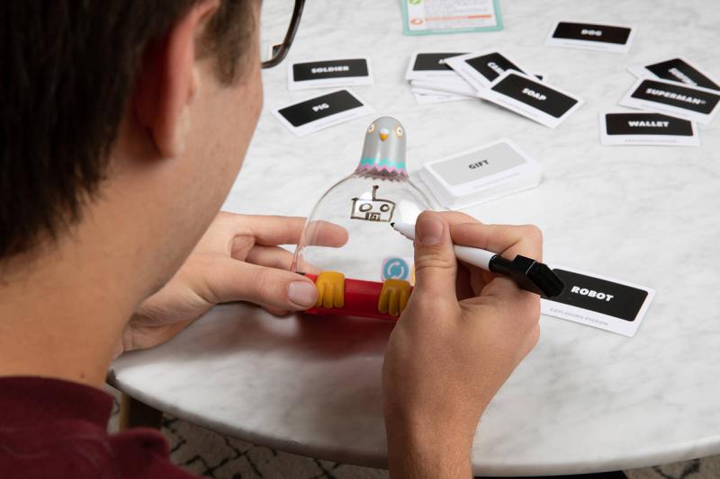 Přimějte svůj tým uhodnout slovo na vaší kartě tím, že ho nakreslíte na průhlednou část holubího šejkru pomocí stíratelného fixu. Nesmíte psát písmena, číslice ani jiné znaky. Nejste zodpovědní za mazání toho, co nakreslíte!