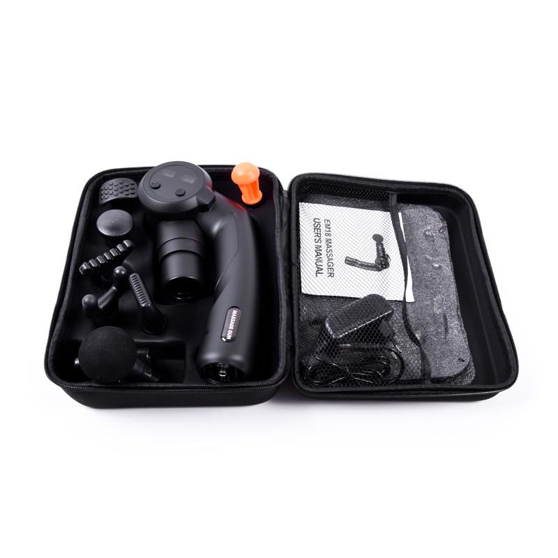 Masážna pištoľ je praktický pomocník pre zmiernenie svalového napätia, stuhnutosti a bolesti, zároveň zvyšuje rozsah pohybu a podporuje lepšiu cirkuláciu krvi. Vďaka tomu je vhodná pre efektívnu regeneráciu svalov a úľavu od kŕčov po náročnom tréningu či fyzickej záťaži.\n\nErgonomický dizajn s rukoväťou v tvare písmena L a protišmykovou úpravou zabezpečuje pohodlné a pevné držanie. Otočné rameno umožňuje presne zamerať masáž na konkrétne svalové partie, ktoré vyžadujú pozornosť.\n\nPištoľ ponúka 20 nastaviteľných rýchlostných stupňov, ktoré je možné jednoducho prepínať podľa potreby, a 9 vymeniteľných masážnych hláv určených pre rôzne časti tela. To umožňuje prispôsobenie masáže konkrétnym svalom a požadovanej intenzite.\n\nVýkonný bezkartáčový motor dosahuje až 3200 otáčok za minútu, čo zabezpečuje účinnú masážnu terapiu. Napájanie zabezpečuje zabudovaná lítium-iónová batéria s kapacitou 2500mAh, ktorá vydrží na jedno nabitie až 3 hodiny v závislosti od zvolenej intenzity masáže.\n\nNa dotykovom LCD displeji je možné jednoducho nastaviť rýchlosť a sledovať stav batérie. Pre bezpečnosť je pištoľ vybavená funkciou automatického vypnutia po 10 minútach prevádzky a pracuje pritom veľmi ticho.\n\nMasážna pištoľ je dodávaná v praktickom kufríku, ktorý uľahčuje jej prenášanie a ochranu pri cestách.\n\nVlastnosti a funkcie:\n\n• Doba prevádzky až 3 hodiny na jedno nabitie podľa intenzity\n• Regenerácia svalov po športe a fyzickej aktivite\n• Zmiernenie stuhnutosti a svalového napätia, zlepšenie prietoku krvi\n• 9 masážnych nástavcov pre rôzne svalové skupiny\n• Automatické vypínanie po 10 minútach\n• Tichý chod pre pohodlné použitie\n• Displej zobrazujúci stav batérie\n• Praktické puzdro pre jednoduché prenášanie\n• Otočná hlava s 8 polohami pre lepší prístup\n\nTechnické parametre:\n\n• Materiál: ABS, hliník, oceľ\n• Typ motora: bezkartáčový\n• Batéria: dobíjacia 12V Li-Ion 2500mAh\n• Výdrž batérie: až 3 hodiny podľa intenzity\n• Frekvencia vibrácií: 1200-3200 ot./min\n• Výkon: 20 W\n• Zdvih (amplitúda): až 12 mm\n• Počet rýchlostných stupňov: 20\n• Nástavce: 9 rôznych pre celé telo\n• Doba nabíjania: 4-6 hodín\n• Hmotnosť: 1 kg\n\nMasážna pištoľ ponúka široké možnosti nastavenia a vďaka rôznym nástavcom je vhodná pre cielenú starostlivosť o celé telo. Je ideálnou voľbou pre športovcov aj pre tých, ktorí hľadajú úľavu od svalového napätia po dlhom dni. Praktické puzdro uľahčuje prenášanie a ochranu prístroja, čo umožňuje využiť masáž kedykoľvek a kdekoľvek.\n\nZhrnutie kľúčových vlastností:\n\nMasážna pištoľ sa vyznačuje dlhou výdržou batérie, vysokým počtom nastaviteľných rýchlostí a bohatou sadou nástavcov, ktoré prinášajú efektívnu a prispôsobiteľnú masáž. Jej ergonomický dizajn a tichý chod zaručujú pohodlné používanie. Tento prístroj ocení každý, kto chce podporiť regeneráciu svalov a zmierniť napätie bezpečným a praktickým spôsobom.\n\nVďaka všetkým funkciám a príslušenstvu je táto masážna pištoľ spoľahlivým partnerom pre každodennú starostlivosť o svaly.