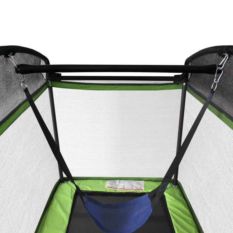 - Ochranná sieť z pevného PE materiálu zabraňuje vypadnutiu používateľa mimo trampolínu. Vstupný otvor je uzatvárateľný zipsom v tvare L, ktorý je navyše zabezpečený bezpečnostným zapínaním na niekoľkých miestach.