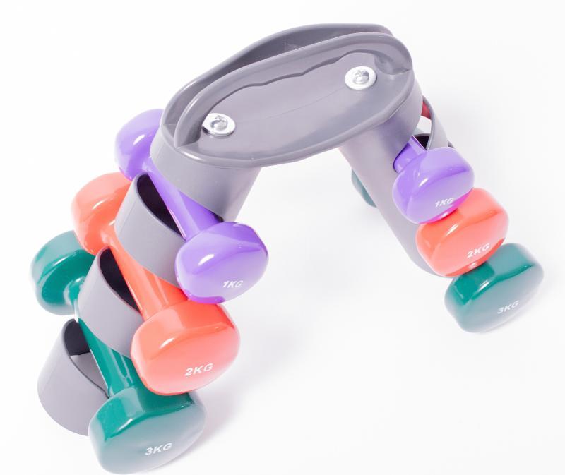 Sada fitness činek s praktickým stojanem nabízí tři váhové varianty pro aerobní cvičení a efektivní organizaci prostoru. zobrazit celý popis