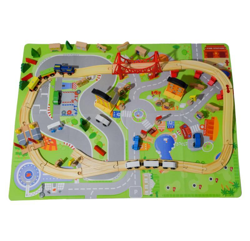 Sada obsahuje - části kolejnic s mostem, nákladní vlak, osobní vlak, auta, sada stromů a značek, zvířátek