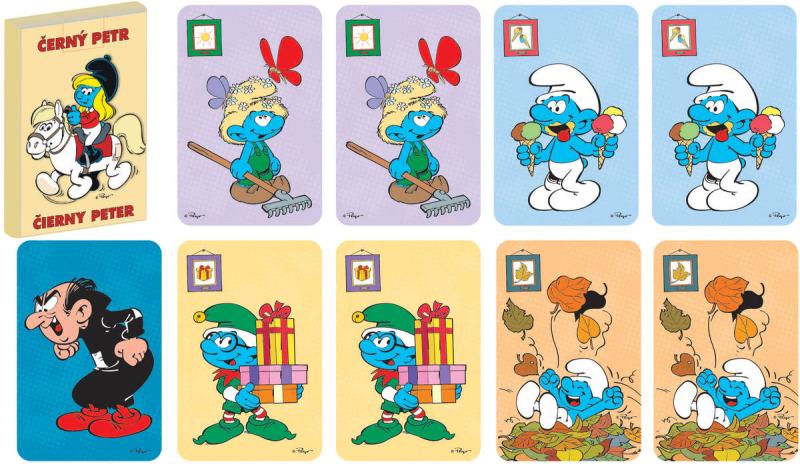 Karetní hra Černý Petr s motivem Šmoulové. Karty mají zakulacené rohy. Pevný karton s lesklou povrchovou úpravou - vodoodpudivá, krabička i karty. 12 dvojic (+ Černý Petr).Černý Petr je oblíbená karetní hra. Základem hry, při které jednotliví hráči tahají mezi sebou karty a hledají stejné dvojice, je neskončit v závěru s Černým Petrem v ruce. Černý Petr je karta, která nemá svoji dvojici a