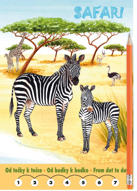 AKIM Omalovánky Od tečky k tečce, s motivem Zvířátka Safari. Součástí grafitová tužka s gumou. 20 stran včetně obálky, z toho 16 obrázků k vykresleníPrincip: tečky jsou označeny čísly a jejich spojením v pořadí 1, 2,, 3, ....... atd. vznikne obrázek = perokresba pro vykreslení. Návodem barevnosti pro všechny obrázky na vnitřních stranách jsou zmenšené obrázky na obálce.