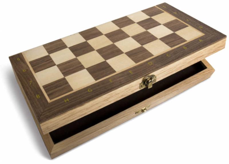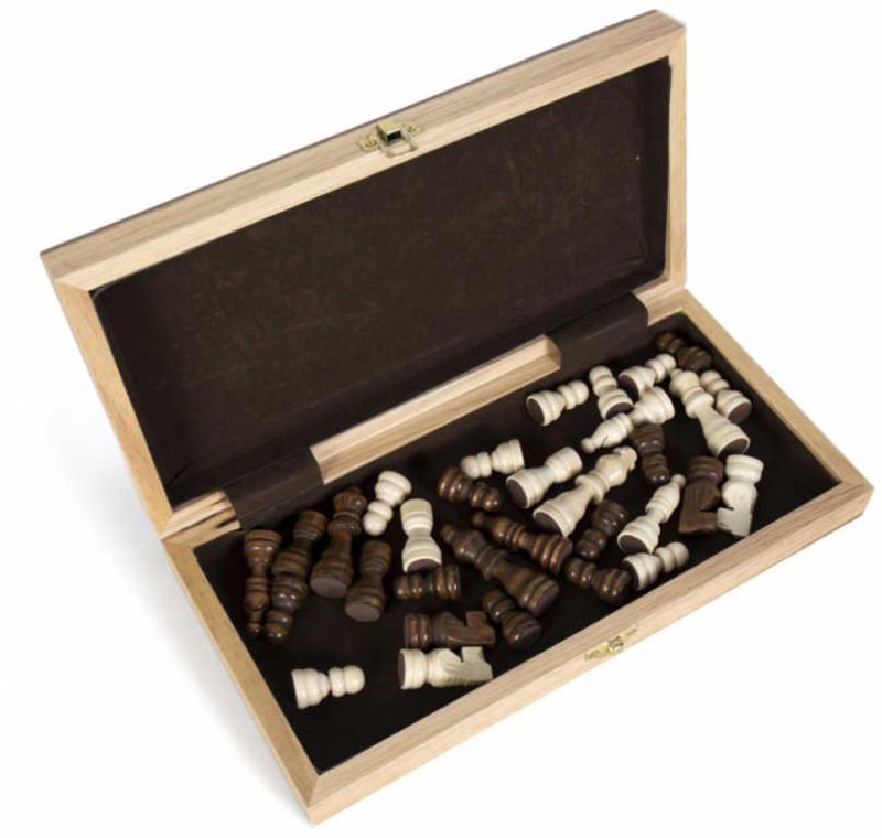 Obsah balení: dřevěná polstrovaná otevírací šachovnice, dřevěné šachové figurky, šachová pravidla včetně netradičních variant