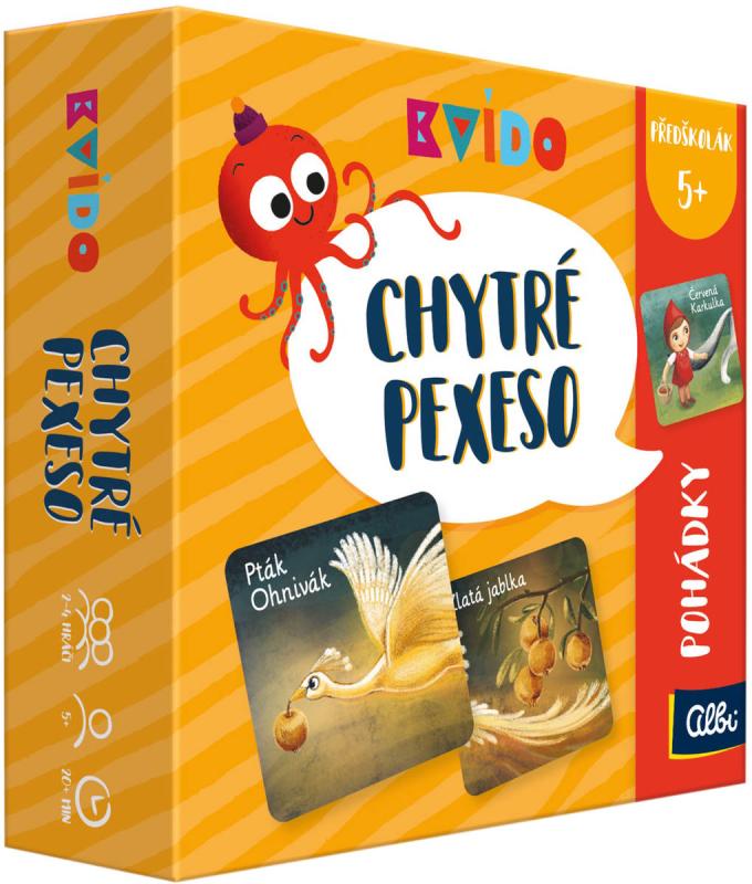 Chytré pexeso - Pohádky od Albi, z edice Kvído.Chytrá pexesa z koncepce Kvído rozvíjí u dětí pozornost, paměť, logické uvažování a zábavnou metodou učí školní děti angličtině. Pexesa jsou vyrobena na principu vědomostních pexes, kdy děti nehledají dva stejné
