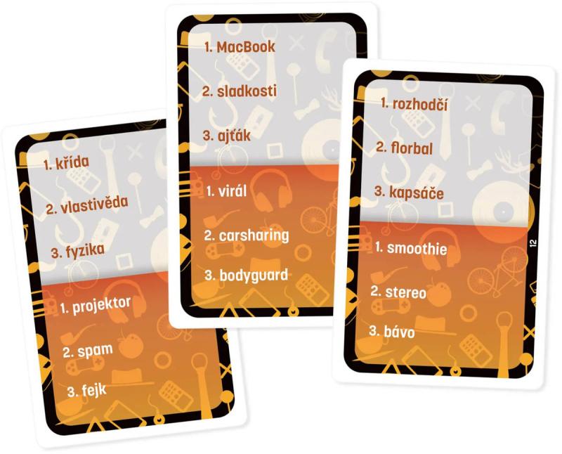 Hra obsahuje: herní plán, 400 karet obsahujících 2 400 slov, přesýpací hodiny, 2 figurky, pravidla hry