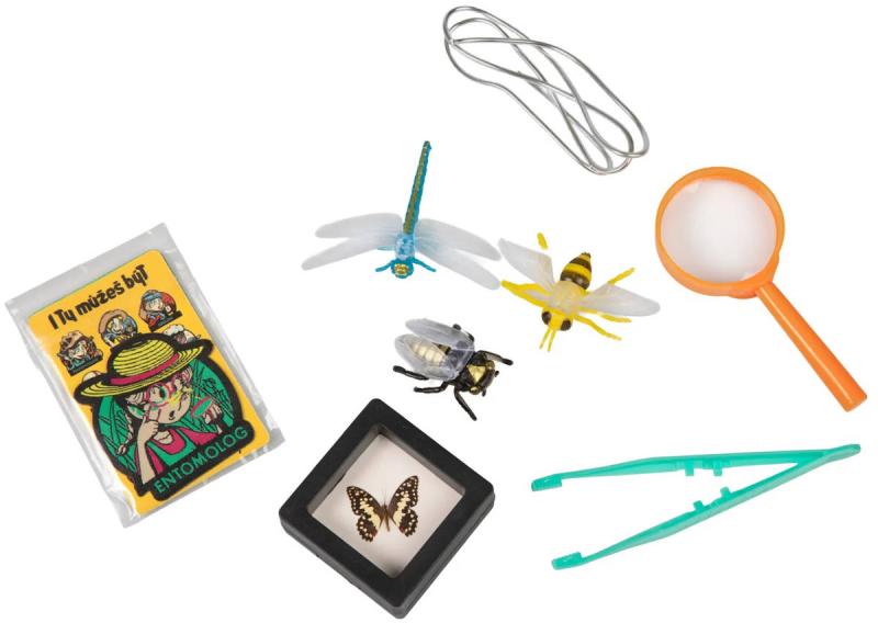 Sada Entomolog obsahuje: 3 modely plastového hmyzu, 1 pinzetu, 1 lupu, 1 stojánek na vystavení, 1 drát, 3 studijní karty, 1 nášivku Entomologa, návod
