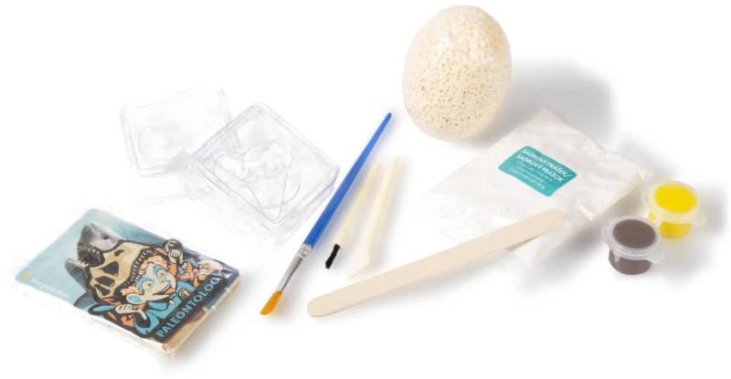 Sada Paleontolog obsahuje: 1 dláto, 1 štětec, 1 malířský štětec, 1 blok na kopání, 1 sádrový prášek, 4 formy, 1 míchátko, 2 barvy, 4 studijní karty, 1 nášivku Paleontologa, návod