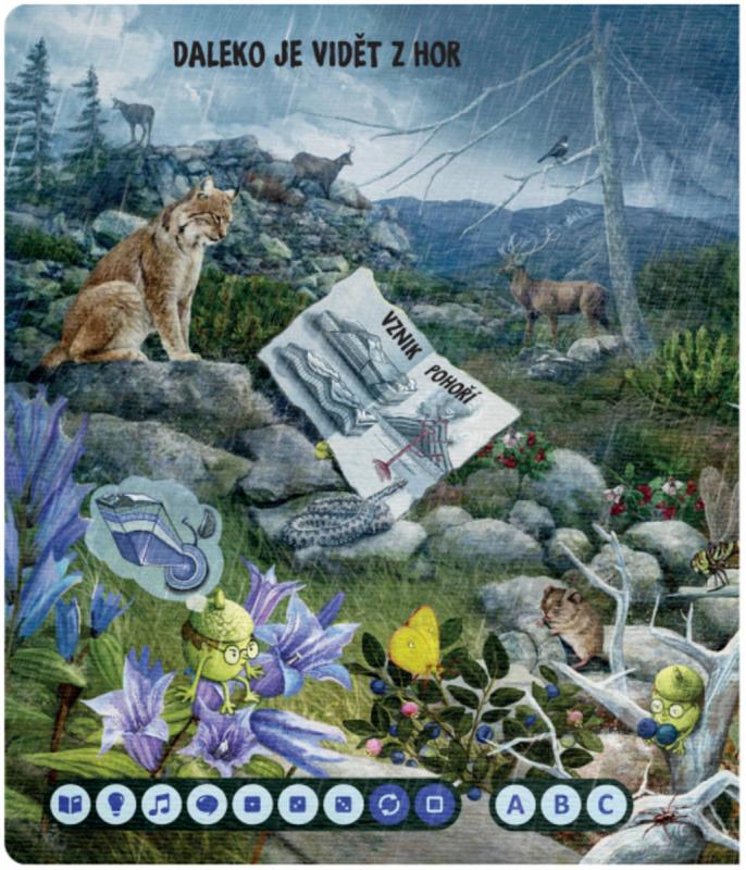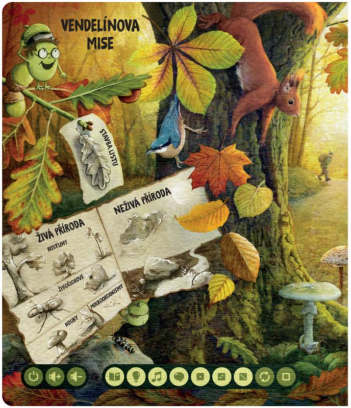 Hravá přírodověda - Interaktivní mluvicí kniha z produktové řady "Kouzelné čtení" od Albi.Interaktivní mluvící dětská kniha Hravá přírodověda z edice Kouzelné čtení seznámí děti od 6 let se základy přírodovědy. Knihou je provede žalud Vendelín, který se rozhodl, že když už měl to štěstí a neskončil žádnému zvířeti v žaludku, najde si místo, kde zakoření a stane se statným dubem. Děti si v knize s Vendelínem projdou různými biotopy a jejich základními složkami. Vendelín jim prozradí co je živá a neživá příroda, jak se vyvíjí motýl, co je to potravní řetězec, jaké se u nás nacházejí horniny, co se dozvíme z letokruhů stromů a spoustu dalšího. V knize Hravá přírodověda nechybí kvízy ve 3 obtížnostech. Děti si tak můžou vybrat obtížnost a ověřit si, co si z knihy zapamatovaly. Těšit se můžete také na dialogy a básničky, které děti uslyší nejen od vypravěčů, ale i od samotného Vendelína. Kniha Hravá přírodověda obsahuje přes 2800 zvuků a textů.