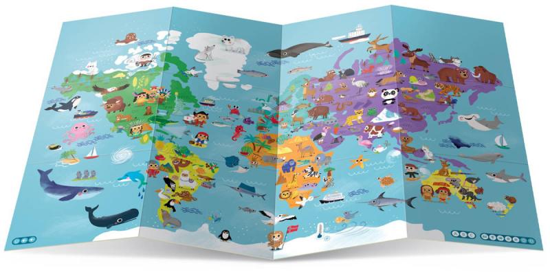 Mapa světa pro děti - Interaktivní mluvicí mapa z produktové řady "Kouzelné čtení" od Albi.S interaktivní naučnou Mapou světa pro děti z edice Kouzelné čtení procestujete celý svět a dozvíte se mnoho zajímavých informací. Mapa nabídne dětem od 5 let informace o známých i méně známých zvířatech, rostlinách i zajímavých místech. Slepici a kohouta známe všichni, ale odkud pocházejí? Víte, který živočich se skrývá pod jazykolamem humuhumunukunukuapua'a nebo kde měli svou základnu piráti? Stačí mapu rozložit a procestovat ji s pomocí elektronické Albi tužky. Mapa je vyrobena z odolného materiálu, který se jen tak neroztrhne, takže ji váš malý objevitel nebo objevitelka může bez obav prozkoumávat – ať už na zemi nebo zavěšenou na stěně dětského pokojíčku. Tak vzhůru za poznáním a zábavou! Mapa obsahuje přes 700 zvukových stop.