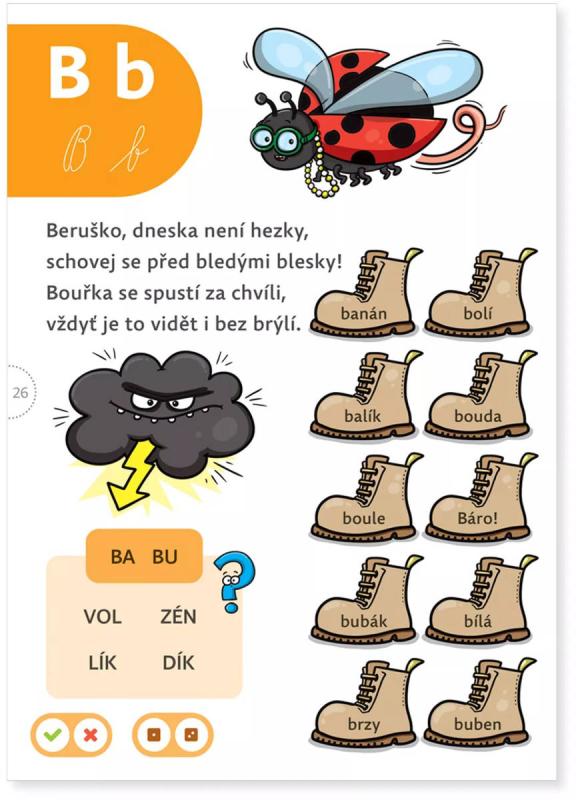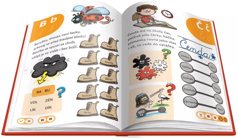 Každé z písmen české abecedy vidí děti ve všech tiskacích i psacích podobách. Jednotlivým samohláskám a souhláskám je věnován vždy ucelený blok zábavných úkolů, které podporují procvičení i upevnění výuky čtení. Děti od 6 let si postupně osvojí znalosti všech písmen a následně jsou schopné číst slova různých obtížností. Díky elektronické tužce se mohou učit interaktivně a naposlouchat správnou intonaci. Učebnice je vhodná také pro domácí vzdělávání a zábavné procvičování čtení. Kniha obsahuje přes 3 000 zvukových stop.