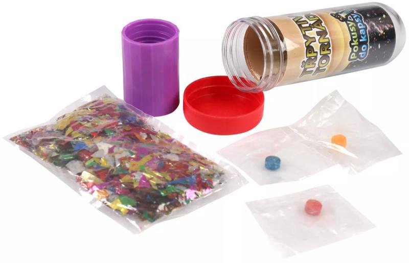 Obsah balení: 2 tablety měnící barvu, trubička na spojení PET lahví, pinzeta, kousky barevné třpytivé fólie