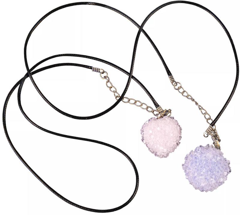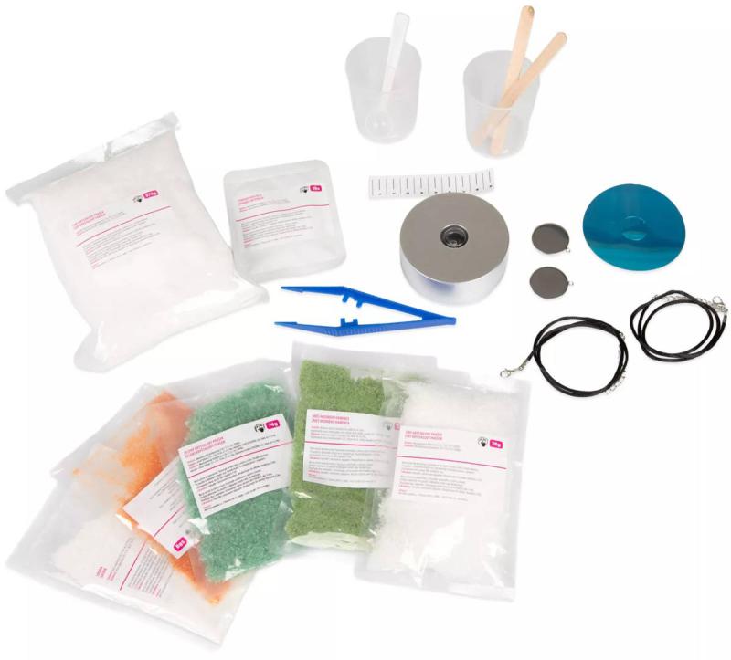 Obsah balení: 1 krystalový prášek 160 g, 1 sáček sádry, 1 měřící kelímek, 2 lahvičky barviva, 1 bavlněný provázek, 2 kovové tvary pro krystalový přívěšek, 1 zelený krystalový prášek 80 g, 1 bílý krystalový prášek 80 g, 1 bílý krystalový prášek 250 g, 2 krystalové zárodky pro krystaly bez očka, 2 kovové kroužky, 2 přívěskové šňůrky, 2 zapínání na přívěsek, 1 velkou kádinku (1000 ml), 1 špachtli, 1 pinzetu, 4 menší plastové kelímky 100 ml, 1 LED světýlko, 1 kruhovou zrcadlovou fólii, 1 střední plastový kelímek pro růst 5 cm krystalu, 1 velký kelímek pro růst 10 cm krystalu (1000 ml), 1 odměrku a návod