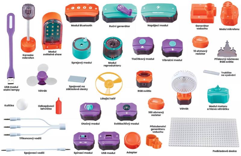 Balení obsahuje: USB lampu, mikrofon, modul Bluetooth, ruční generátor proudu, proudový modul, generátor vzduchu, nahrávací mikrofon, RGB stojánek, sprejový modul, modul klaksonu, klíčový modul, vibrační modul, RGB světlo, modul motoru, modul větráčku, 100 ohmový rezistor, 10 ohmový rezistor, příslušenství k modulu větráčku (2×), adaptér (2×), létající talíř, USB modul, světlocitlivý modul, rotační modul, přepínací modul, hlavu větráčku, jednoduchý vodič (10×), tříkoncový vodič (2×), kuličku (2×), podkladovou desku (3×), trubičku na vysávání, odkapávací lahvičku, spojovač na základové desky (6×), návod
