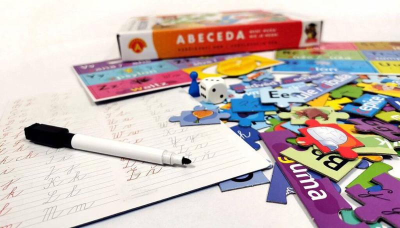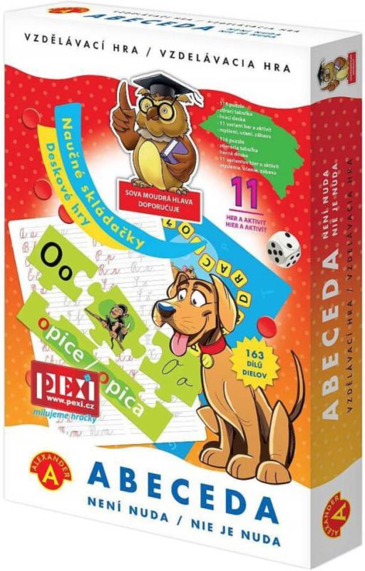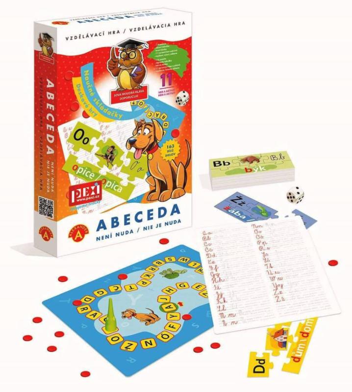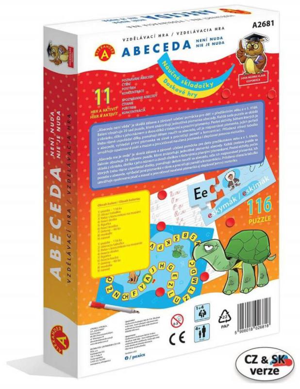 "Abeceda není nuda" je skvělá zábava a zároveň učební pomůcka pro děti v předškolním věku a prvňáčky. Celkem 11 zábavných her a aktivit. Zábavný způsob, jak si poradit s abecedou, jejím čtením a psaním. Hra obsahuje fixku a mazací tabulku, kde děti opakovaně trénují správný úchop pera a zdokonalují psaní písmenek. Trénuje také postřeh a koncentraci.Balení obsahuje 29 sad puzzlí, která znázorňují jednotlivá písmenka abecedy. Každé puzzle se skládá ze čtyř dílků - s obrázkem, s jeho názvem a s odpovídajícími tiskacími a psacími písmenky. Bohaté varianty hry, během nichž je třeba různě uspořádat či vyhledat jednotlivé dílky. Pomáhají dětem naučit se abecedu, dále je učí rozpoznávat písmenka a jejich pořadí v abecedě či vyhledávat počáteční písmenka ve slovech a zároveň procvičují paměť a koncentraci. Přiložená stírací tabulka umožňuje opakovaně psát a procvičovat naučená písmenka a zlepšovat jemnou motoriku. Děti si mohou hrát samy nebo ve větších skupinách. Je vhodné, aby se hry spolu s dětmi zúčastnila dospělá osoba, která bude ukazovat různé verze hry a pomáhat dětem s obtížnějšími úkoly. Pokud se děti teprve začínají učit abecedu, měl by dospělý před zahájením hry urovnat puzzle v abecedním pořadí a číst nahlas název každého písmenka a slovo, které je na obrázku. Další pomůcky žetony, figurka, barevná hrací deska a kostka zvyšují rozmanitost a zaručují dobrou zábavu. Za vítězství ve hře je udělována medaile "Mistr abecedy".