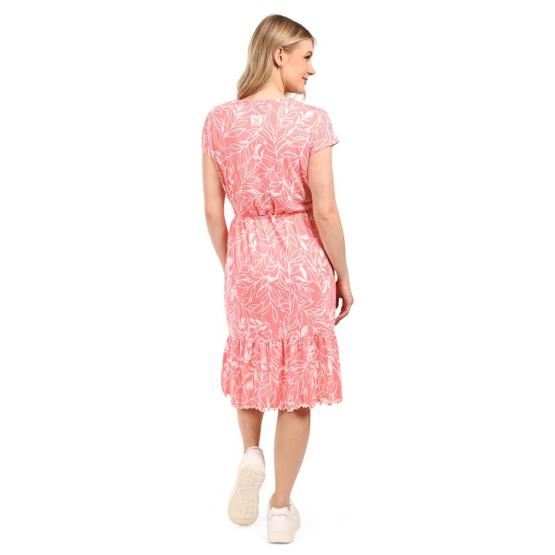 Pružné dámské šaty s polopřiléhavým střihem a délkou pod kolena, ideální pro pohodlné nošení během teplých letních dní.Dámské letní šaty jsou vyrobeny z materiálu obsahujícího 95 % polyesteru a 5 % elastanu, což zajišťuje příjemnou pružnost a volnost pohybu během nošení. Díky celopotištěnému designu působí šaty svěže a moderně, zatímco polopřiléhavý střih a délka pod kolena elegantně zvýrazňují ženskou siluetu. Součástí je pásek, který umožňuje upravit tvar šatů a zvýraznit pas podle osobních preferencí. Na zadním dílu se nachází decentní nášivka, která doplňuje celkový vzhled a dodává šatům originální detail.