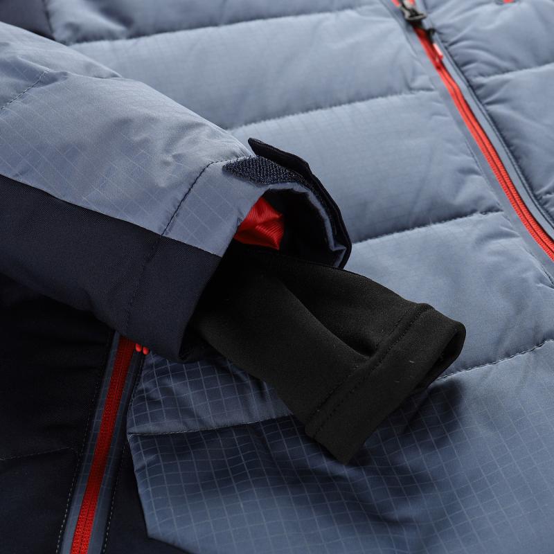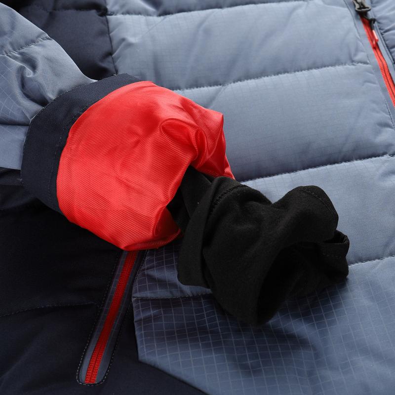 Tato pánská péřová lyžařská bunda je navržena tak, aby poskytovala spolehlivou ochranu a pohodlí při zimních sportech. Vyrobena je ze 100% polyesteru s membránou PTX SNOW, která zajišťuje vodní sloupec 10 000 mm a paropropustnost 10 000 g/m2/24h, což znamená, že bunda je zároveň nepromokavá, větruodolná a umožňuje odvod vlhkosti z těla. Materiál je opatřen úpravou DWR, která odpuzuje vodu a nečistoty, a má Ret hodnotu nižší než 10, což zaručuje dobrou prodyšnost.