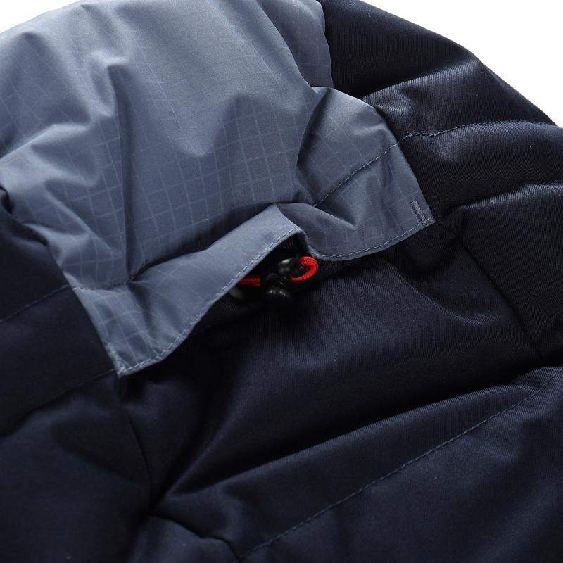 Výplň bundy tvoří střední množství prachového peří, které poskytuje dostatečné hřejivé vlastnosti bez nadměrného zatížení. Materiál bundy je pružný a celopotištěný, což přispívá k lepší odolnosti a estetice. Na rukávu je umístěna decentní nášivka značky.