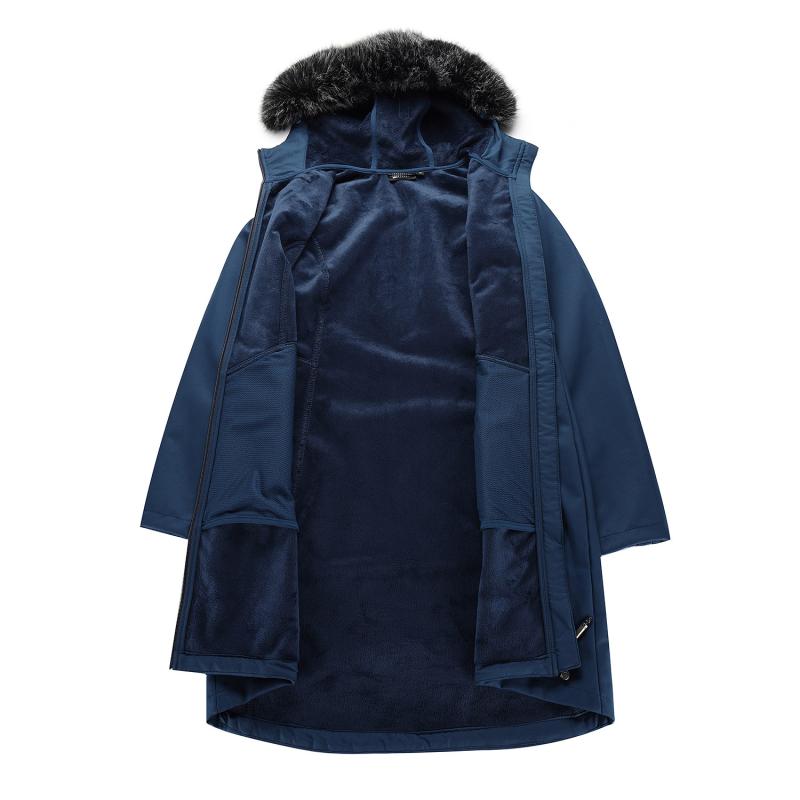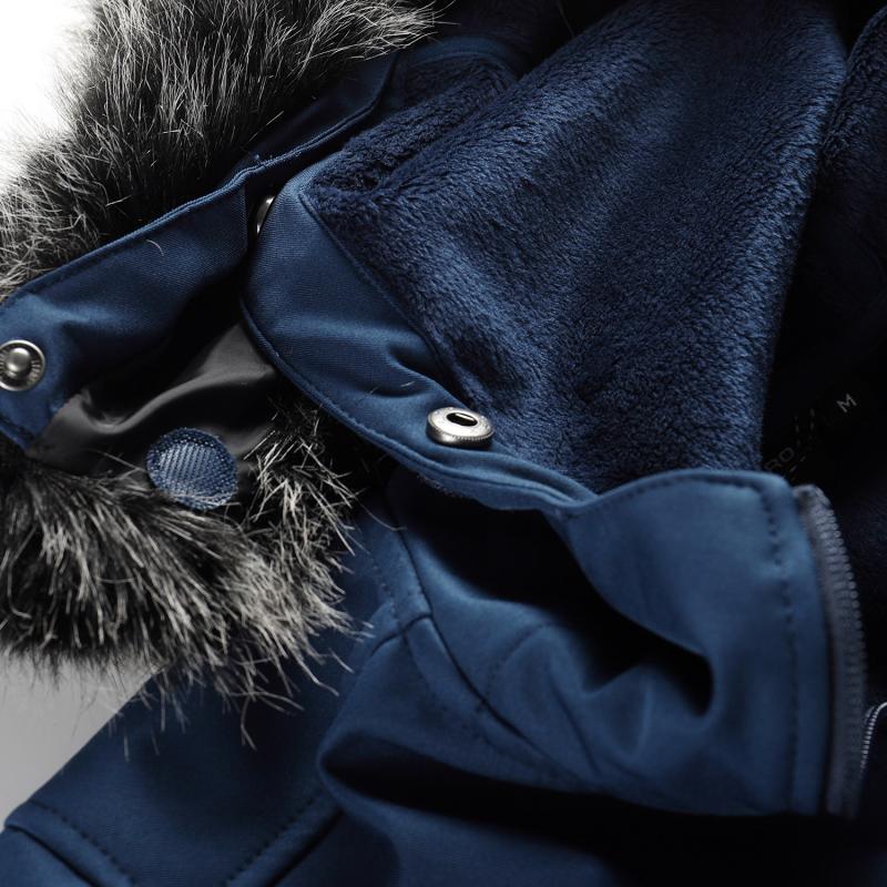 Střih kabátu je přiléhavý, což podtrhuje ženskou siluetu, a prodloužená spodní část vzadu lépe kryje záda proti větru. Kapuce je neodepínatelná a lze ji stáhnout podle potřeby, což přispívá k lepší ochraně hlavy. Pro ještě větší pohodlí je u krku hřejivá krytka a odnímatelná umělá kožešina, která přidává na teple a stylu.