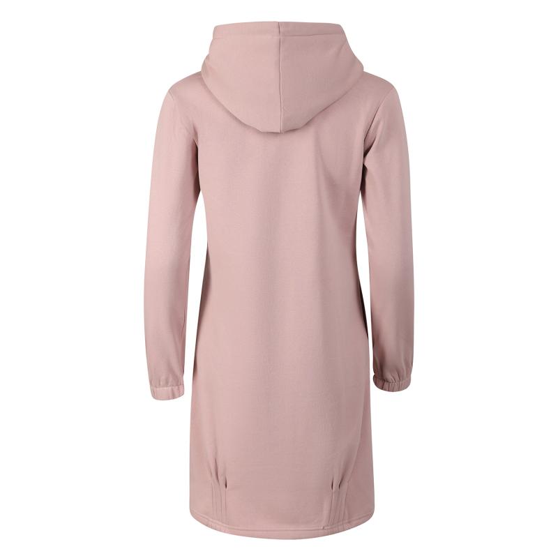 Dámske šaty z bavlneného a polyesterového materiálu s polopriliehavým strihom, dvojitou kapucňou a praktickými vreckami pre pohodlné nosenie. Zobrazit celý popis