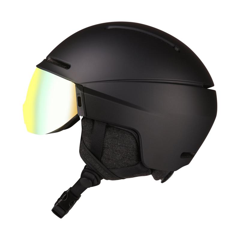 Díky pevnému zapínání se helma bezpečně přizpůsobí hlavě a poutko zabraňuje smeknutí brýlí, takže zůstávají vždy na svém místě. Protisluneční štít kategorie S3 chrání oči před oslněním a je ideální pro jasné až polojasné počasí. Helma je vybavena větracími otvory, které zajišťují optimální proudění vzduchu a zabraňují nadměrnému pocení, což přispívá k pohodlí i při delším nošení. Měkčený popruh pod bradou zvyšuje komfort a zabraňuje nepříjemnému tlaku.