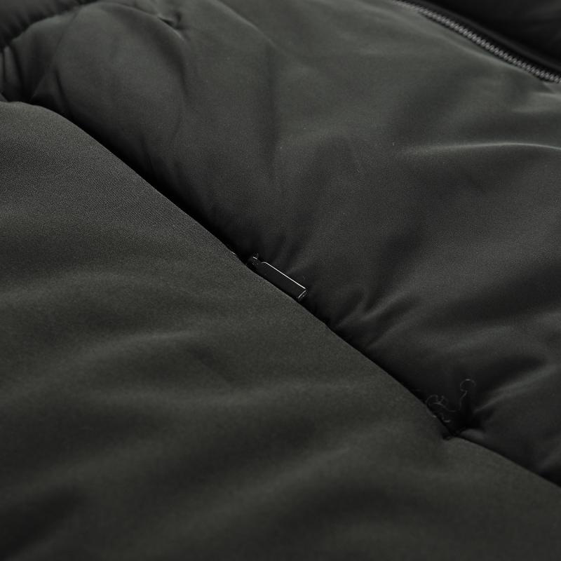Kabát je ozvláštnený dekoratívnym prešívaním a ponúka praktické prvky, ako je odopínateľná kapucňa so sťahovaním a odopínateľná kožušina, ktoré umožňujú prispôsobiť vzhľad podľa aktuálnych potrieb a počasia. Zapínanie je riešené dlhým dvojcestným zipsom, čo uľahčuje manipuláciu a vetranie.