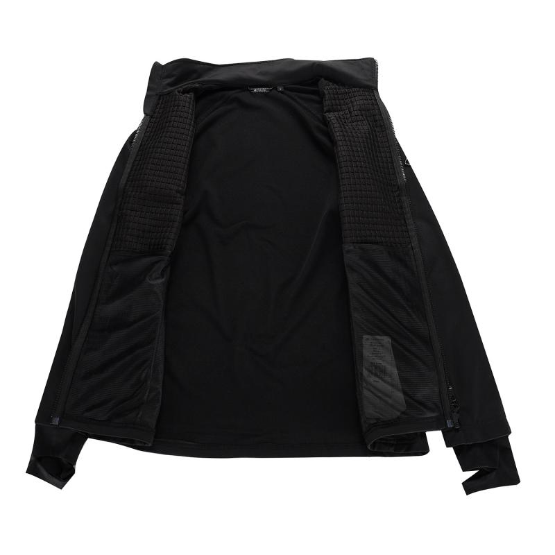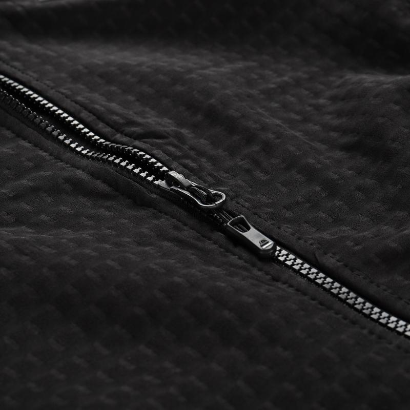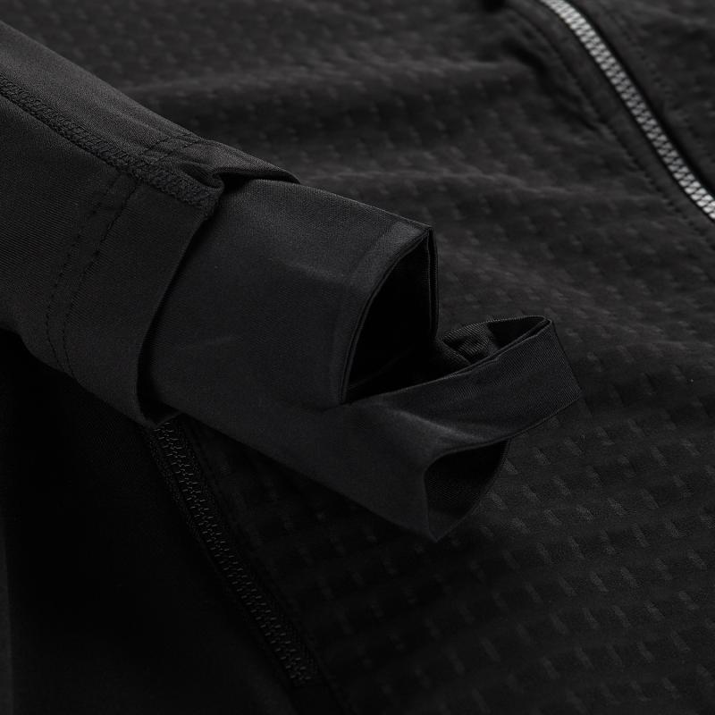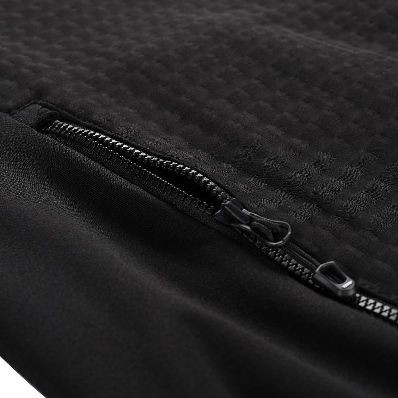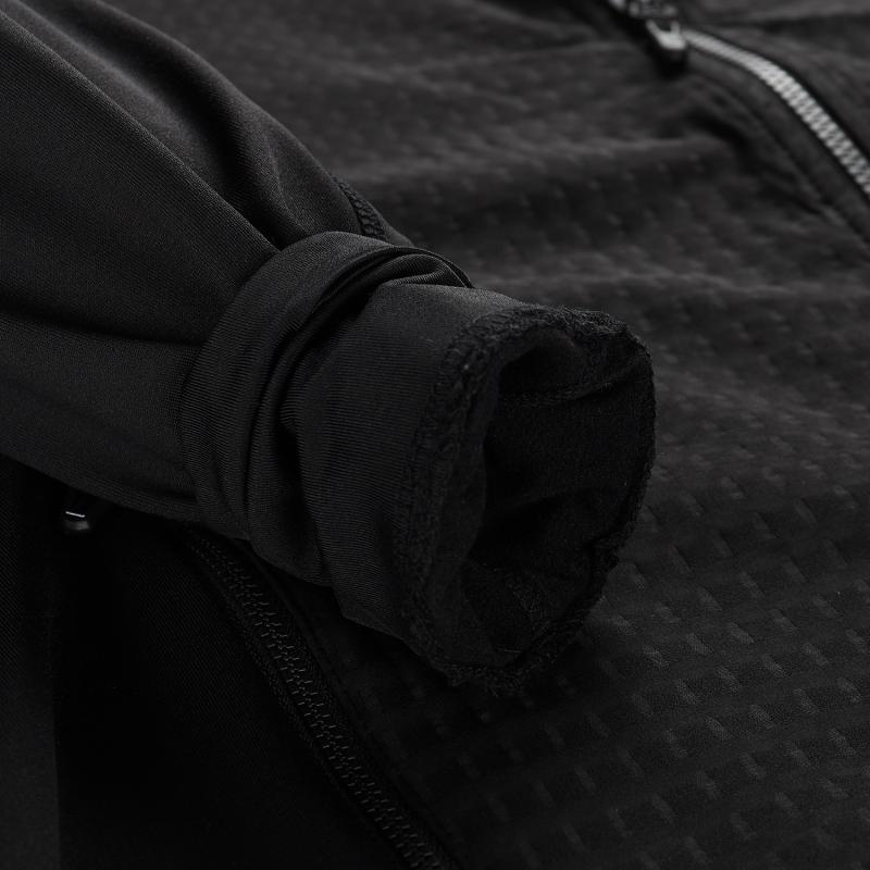 Táto mikina je vyrobená z materiálu, ktorý kombinuje vetruodolnosť, priedušnosť a rýchle schnutie s vysokou pružnosťou, čo zaisťuje pohodlie a hrejivý komfort pri rôznych aktivitách. Kontrastný embosovaný materiál dodáva moderný vzhľad a spolu s priliehavým strihom a plochými švami prispieva k pohodlnému pohybu bez otlakov.