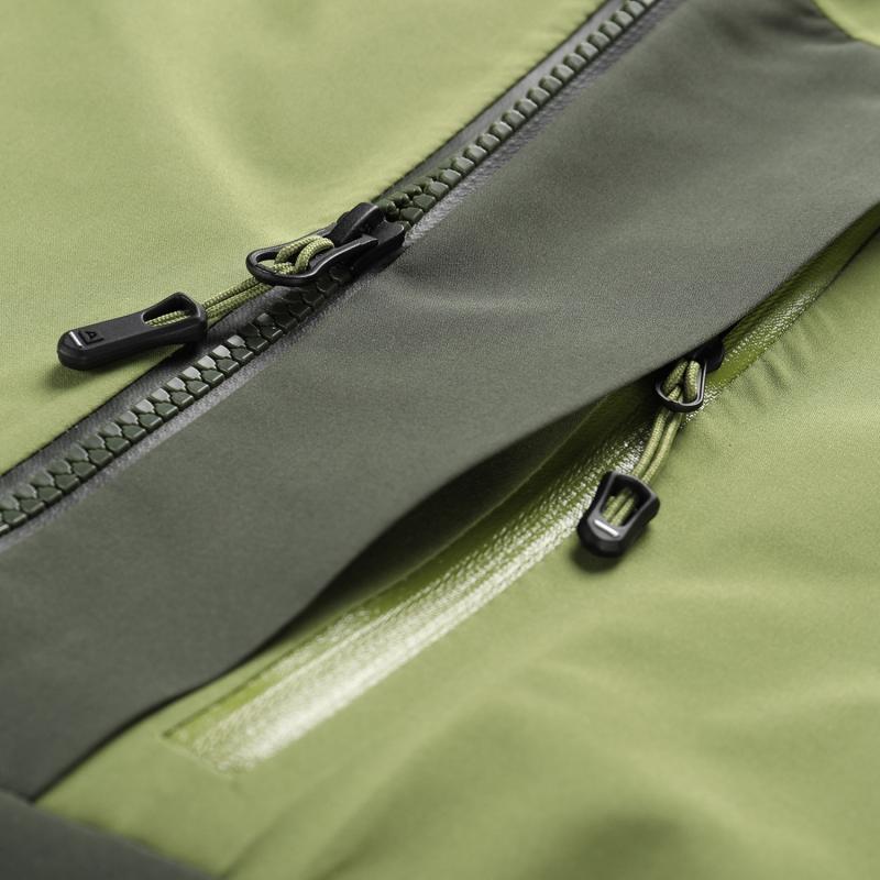Kapuce je neodepínatelná a opatřená stahováním, doplněná o hřejivou krytku u brady, která chrání před větrem a chladem. Voděodolný hlavní zip společně s odvětráváním v podpaží vybaveným voděodolnými zipy umožňuje snadnou regulaci teploty během fyzické aktivity. Rukávy mají stahování na suchý zip a elastickou manžetu pro lepší těsnost a komfort. Spodní část bundy je vzadu prodloužená a lze ji stáhnout gumičkou, což zvyšuje ochranu proti větru.