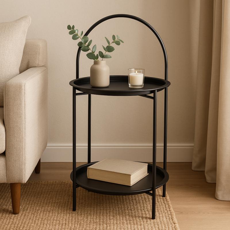 Odkládací stolek nabízí kombinaci funkčnosti a jednoduchého stylu díky pevnému černému kovovému rámu a dvěma praktickým policím, které poskytují dostatek místa pro uložení drobností nebo dekorací. Vrchní část je vybavena úchytem, který usnadňuje přesun stolku podle potřeby, což zvyšuje jeho mobilitu a využitelnost v různých částech domácnosti nebo kanceláře.
