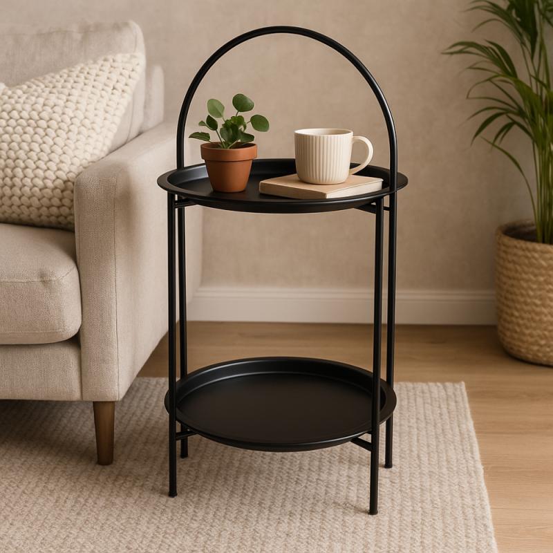 Kovový odkládací stolek s dvěma policemi a praktickým úchytem pro snadné přemísťování. Stabilní konstrukce a moderní design vhodný do různých interiérů.