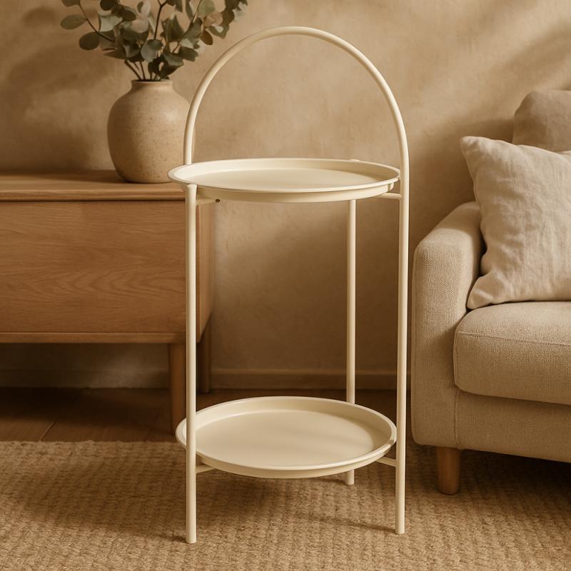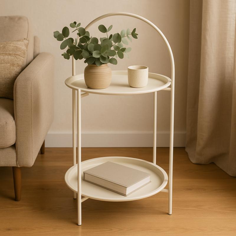 Kovový stolek s dvěma policemi a úchytem pro snadné přemísťování nabízí praktické úložné řešení v moderním designu.Odkládací stolek je vybaven černým kovovým rámem a dvěma policemi, které poskytují dostatek prostoru pro uložení drobností či dekorací.