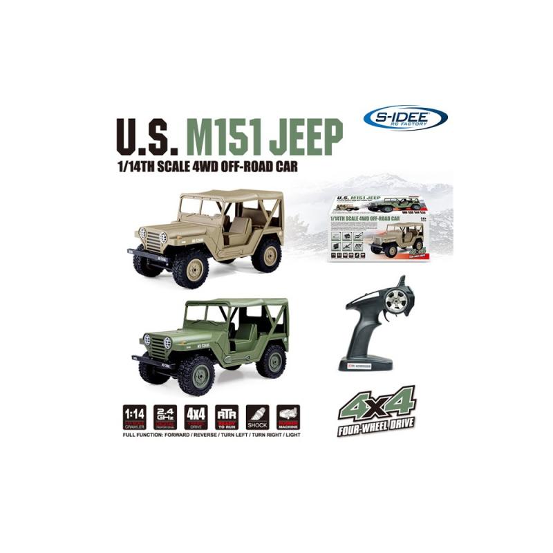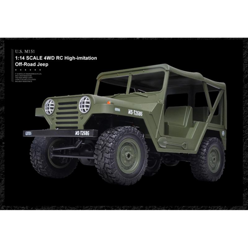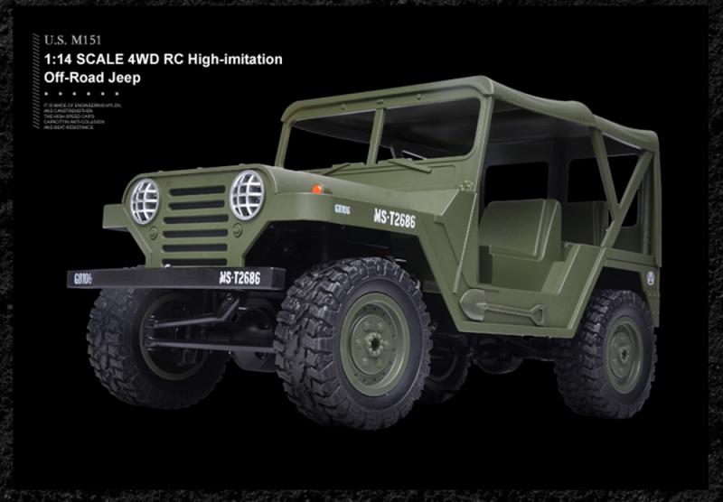 Americký jeep M151 4WD s LED osvětlením v měřítku 1:14. Dokonalá imitace amerických jeepů z 2. světové války.Americký JEEP v krásném provedení na dálkové ovládání 2,4Ghz, s předním osvětlením, s náhonem 4x4 a plně proporcionální jídzou v měřítku 1:14. Zvládá jízdu v náročném terénu, takže můžete jezdit venku na trávě, štěrku, kamenech i sněhu. Doba jízdy až 30 minut. Doba nabíjení cca 150 minut. Dosah dálkového ovládání cca 50 m. Akumulátor je uložen pod přední kapotou, kterou lze snadno odklopit, což je velice praktické.