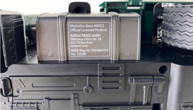 Model je vyroben v maketovém provedení s důrazem na detail a autentické prvky, které podtrhují jeho věrnost skutečnému sklápěči. Pneumatiky z pravé gumy zajistí dobrou přilnavost na různých površích, zatímco LED osvětlení vpředu i vzadu, včetně blinkrů a dvou žlutých výstražných světel na střeše, umožňuje provoz i za snížené viditelnosti.