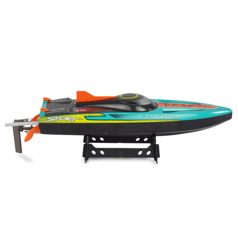 Citlivý vysílač 2,4 GHz s různými možnostmi nastavení, jako je omezení výchylky řízení, či dvojí nastavení rychlosti, zajišťuje přesné, kontrolované chování při jízdě. Již sestavené trimovací desky na lodi poskytují dodatečnou stabilitu v rychlých zatáčkách nebo rozbouřených vodách. Trup je dvojitě utěsněn a tím optimálně chráněn proti pronikání vody. Kromě toho je pod průhledným krytem připevněn jasný LED pásek, který lze zapínat a vypínat pomocí dálkového ovladače a umožňuje působivý pohled i za soumraku. Při nízkém napětí baterie v modelu vysílač varuje pípnutím a signalizuje, že je nutný okamžitý návrat na břeh.