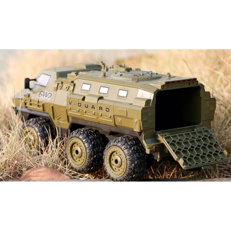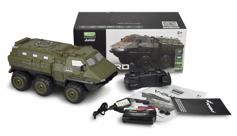 Replika obrněných vozidel v měřítku 1:16 používaná armádou nebo policií zaujme svou robustní konstrukcí, pohonem šesti koly (6WD) a relativně vysokou maximální rychlostí až 20 km / h. Díky protiskluzovým gumovým pneumatikám je vždy zajištěna vysoká trakce. V-Guard bez námahy překonává sklony až 60 stupňů. Stejně jako u tankovému stylu pohonu jsou tři kola na jedné straně vozidla poháněna současně, takže se model může dokonce otáčet na místě řízením v opačném směru. Funkce jízdy vpřed, vzad, vlevo, vpravo a otáčení na místě lze ovládat proporcionálně.