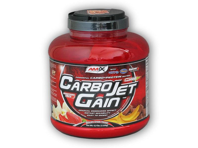 CarboJet Gain s příchutí čokoláda obsahuje: Amix ®Protein Blend (ultrafiltrovaný syrovátkový bílkovinný koncentrát, odtučněná syrovátka, aminokyseliny derivované z hovězí bílkoviny, CFM syrovátkový bílkovinný izolát s bílkovinnými frakcemi), Amix ® CarboJet® Matrix (maltodextrin, fruktóza, glukóza, isomaltulosa, škrob Vitargo®), zahušťovadla: xanthan, guma guar, emulgátor: sójový lecitin, kakaový prášek, minerální premix s procentem doporučené denní dávky minerálních látek pod 15% (hydrogenfosforečnan vápenatý, hydrogenfosforečnan draselný, hydrogenfosforečnan sodný), multienzymový komplex DigeZyme® (amyláza, celuláza, laktáza, lipáza, bakteriální neutrální proteáza), sladidlo: sukralosa (Splenda®), acesulfam K