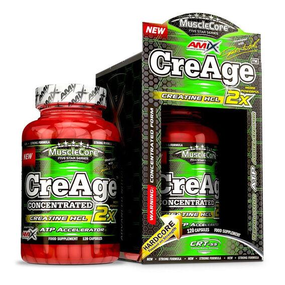 CreAge MuscleCore sú kapsule s obsahom Kreatínu HCL.CreAge™ obsahuje kreatín naviazaný na HCL skupinu. Pri konzumácii sa v žalúdku premení späť na účinný kreatín. Je viac rozpustný vo vode než kreatín monohydrát, ale účinky sú rovnaké.
