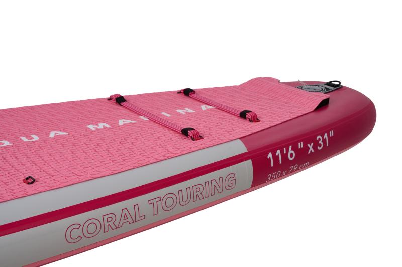 Coral Touring má unikátny tvar so širokým stabilným stredom a pretiahnutou špičkou, ktorá skvele rozráža vodu a pomáha pri jazde držať priamy smer. Ľahko zdvihnutá špička sa hodí pre jazdu na pokojnej vode, na rieke i v menších vlnách na mori. Pre ešte lepší sklz má Coral špeciálnu odtokovú hranu, ktorá umožňuje hladší prúd vody a zabraňuje tvorbe turbulencií za zadnou časťou paddleboardu, ktoré spomaľujú jazdu.