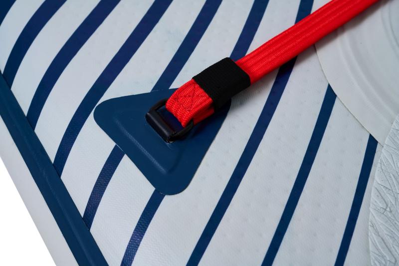Na palube paddleboardu nájdeme nový systém uchytenia nákladu. Je vytvorený z plochých gumičiek RED STRAP™ poskladaných v novom tvare na väčšej ploche, čo nielen skvele vyzerá, ale je tiež veľmi funkčné. Frézovaný nešmykľavý pad s DIAMOND vzorom, ktorý má uzavretú štruktúru, aby neprijímal nečistoty. V zadnej časti padu je zvýšený okraj Kick-pad pre oporu zadnej nohy pri otočkách. D-ringy na palube paddleboardu je možné využiť aj na pripojenie kajakovej sedačky, ktorá však nie je súčasťou balenia.