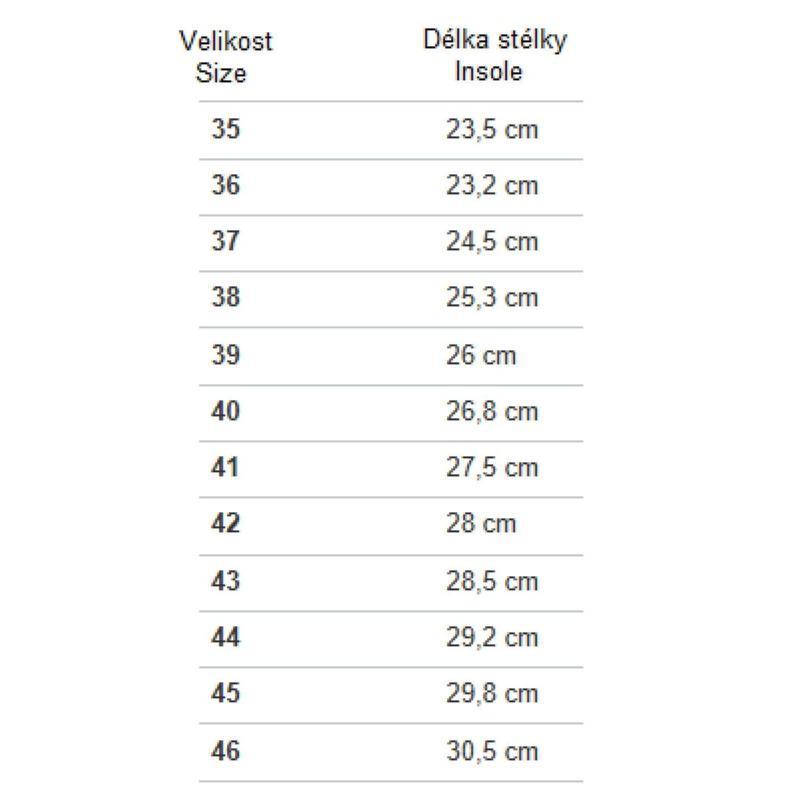 Velikosti odpovídají velikostem EU. Tabulku naleznete v obrázcích. Uvedené hodnoty jsou pouze orientační a s ohledem na konkrétní tvar nohy se může vhodná velikost lišit!