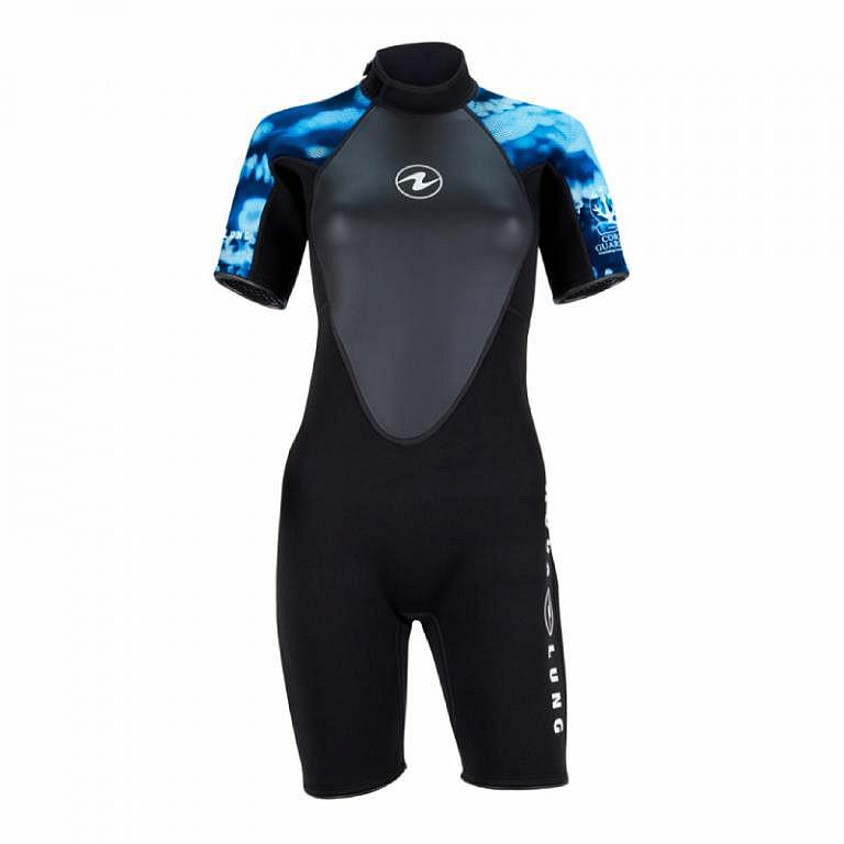 Hrudná časť je vyrobená z materiálu mesh skin, ktorý poskytuje väčšiu odolnosť proti oderu a vetru. Dámsky neoprénový short je vybavený manžetami na zápästí a členkoch, ktoré zabraňujú vniknutiu vody. Tiež ramenné potlačené prvky sú navrhnuté tak, aby chránili oblek proti oderu od kompenzátora vztlaku. Dámsky short má aj potlač na zápästí, ktorá podporuje držanie počítača na mieste. Obliekanie a vyzliekanie uľahčuje popruh pripevnený k jazdcu zipsu.