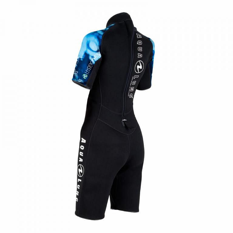 Hrudná časť je vyrobená z materiálu mesh skin, ktorý poskytuje väčšiu odolnosť proti oderu a vetru. Dámsky neoprénový short je vybavený manžetami na zápästí a členkoch, ktoré zabraňujú vniknutiu vody. Tiež ramenné potlačené prvky sú navrhnuté tak, aby chránili oblek proti oderu od kompenzátora vztlaku. Dámsky short má aj potlač na zápästí, ktorá podporuje držanie počítača na mieste. Obliekanie a vyzliekanie uľahčuje popruh pripevnený k jazdcu zipsu.