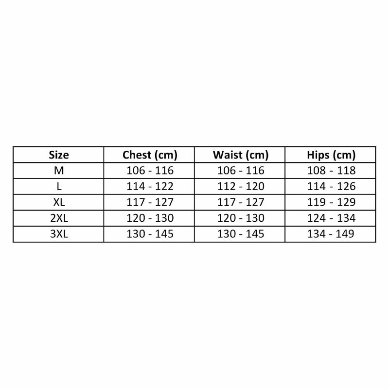 • 3XL: prsa (130/145 cm), pas (130/145 cm), boky (134/149 cm)