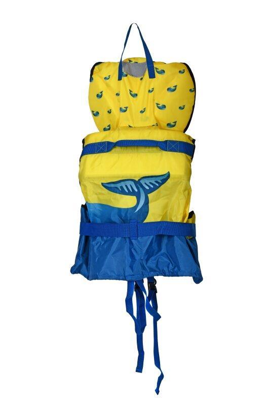 Zapínanie: dva remienky so sponami, dve šnúrky na stiahnutie. Rozkrokové pásky zabraňujú vyklznutiu z vesty. Zhoda s normou PN-EN ISO 12402-04: 2007 Záchranné vesty pre deti majú pohodlný lemovaný rozkrok. Na zadnej strane vesty je všitá rukoväť, ktorá uľahčuje vytiahnutie dieťaťa z vody.