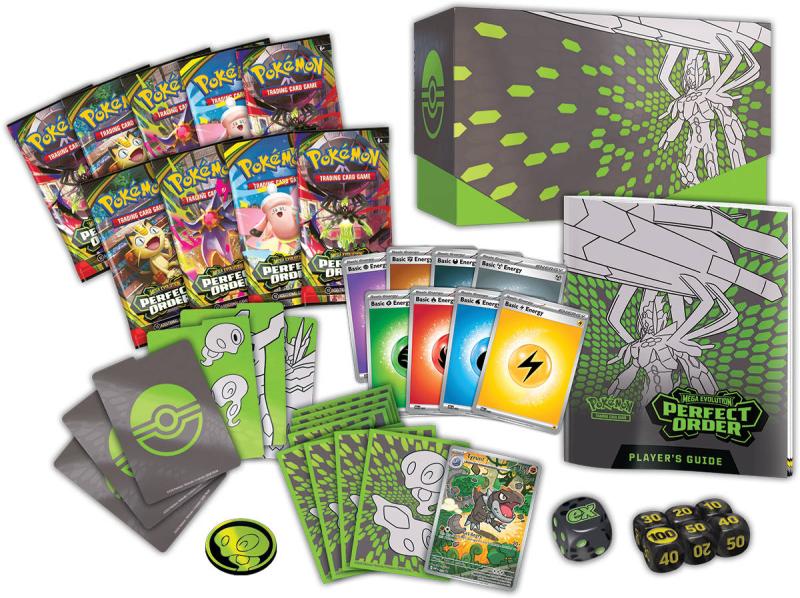 Elite Trainer Box Perfect Order je balení 9 balíčků Pokémon karet, 1 promo karty Tyrunt, 65 obalů, 6 kostek a oddělovačů. Každý balíček obsahuje 10 karet. Celkově tak získáte 90 Pokémon karet.