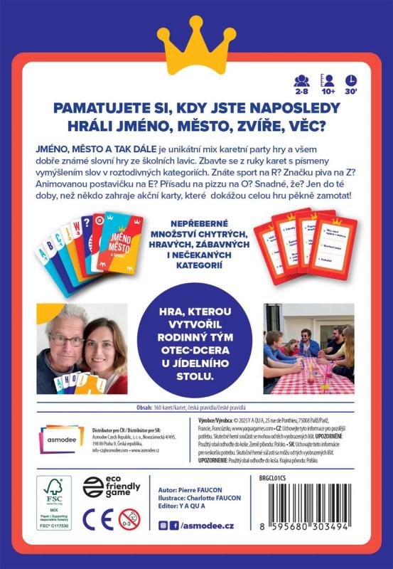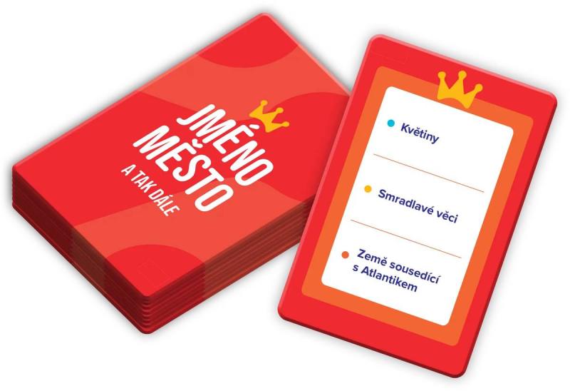 Svižná karetní party hra "Jméno, město a tak dále" — moderní variace klasiky s 160 kartami, akčními kartami, pro 2–8 hráčů (týmově až 20), vhodná od 10 let, doba hry cca 30 min
