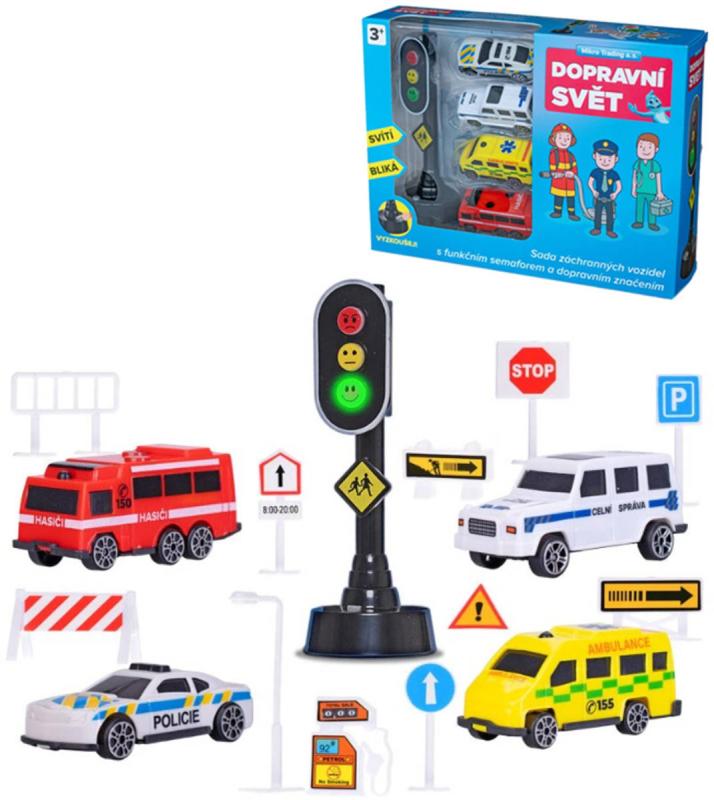 Herní sada Dopravní svět. Součástí 4 autíčka - záchranné složky (hasiči, policie, ambulance, celní správa), dopravní značky a funkční semafor na baterie, se světlem. Velikost aut 7cm.Autíčka - hračka, která fascinuje děti všech věkových kategorií. Od realistických modelů sportovních vozů až po různá vozítka, auta stimulují kreativitu a umožňují dětem prožít vlastní dobrodružství. Jsou ideální nejen pro zábavné hry, ale také pro rozvoj jemné motoriky, koordinace očí a rukou a prostorového myšlení. Hledáte-li dokonalý dárek pro malé motoristické nadšence, autíčka jsou jasnou volbou.