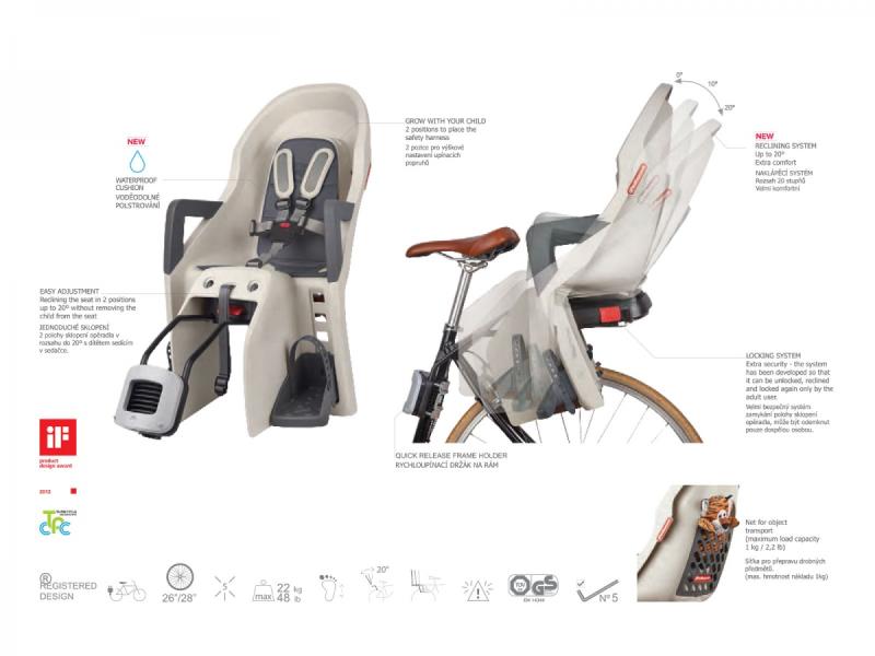 Produkt byl testován podle normy EN14344, která stanovuje bezpečnostní požadavky pro dětské cyklosedačky. Doporučujeme odbornou montáž, aby byla zajištěna maximální bezpečnost a správné upevnění.